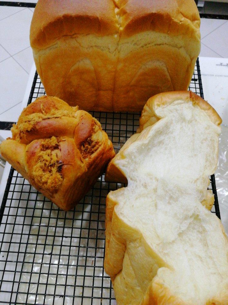 一个懒人 做过 教你做完美的北海道醇香奶油吐司 昨天做的,小火180上火150,应该是下火低了,烘烤不足,出炉就塌了,下次还是得200,不过组织很好,吃着特别好吃,柔软又劲道,奶香十足,面太稀加了面粉,多一块面团做了一个肉松小方,学厨的磨具烤的,倒是很不错#午餐•2020年12月16日# 2020-12-16