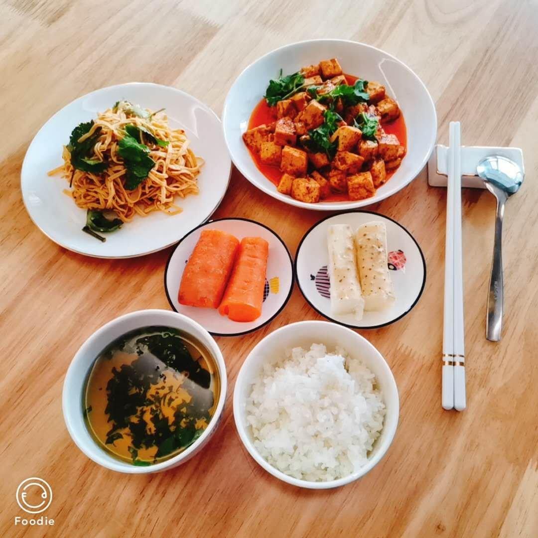 米饭,蒸山药,蒸胡萝卜,麻辣豆腐,拌干豆腐丝,香菜汤。