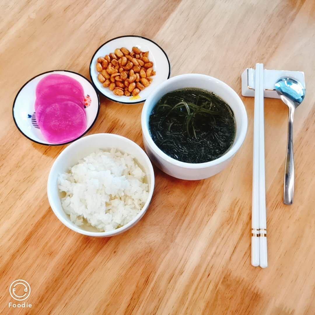白米饭,海带汤,炸黄豆,酸甜白萝卜。