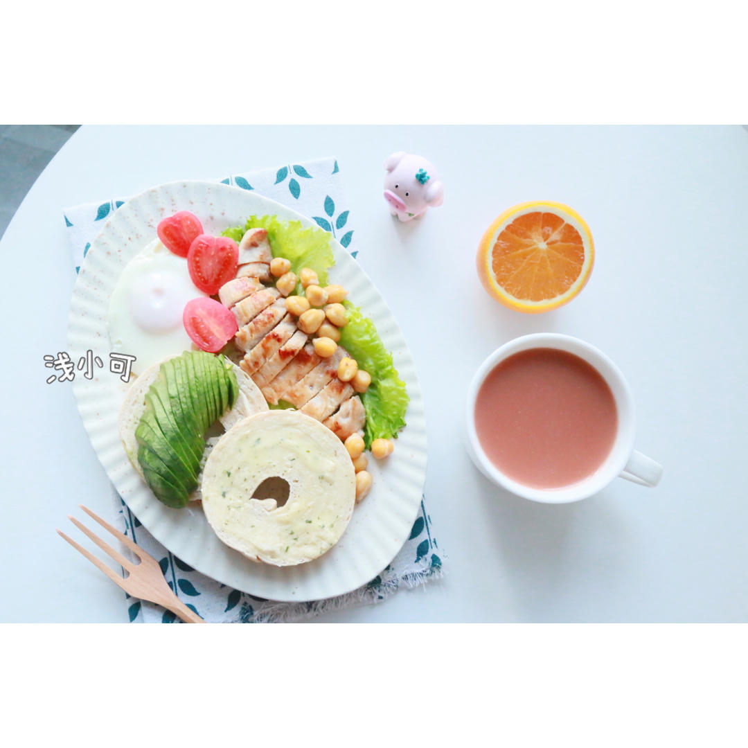 浅_小可 做过 爱心创意早餐 周五早安🍁今日早餐 贝果➕牛油果➕煎蛋➕煎鸡胸肉➕煎鹰嘴豆➕生菜➕果冻橙➕紫萝卜燕麦糊贝果抹了蒜香稀奶油 敲好吃😋#早餐•2021年1月29日# #浅小可创意早餐# 2021-01-29