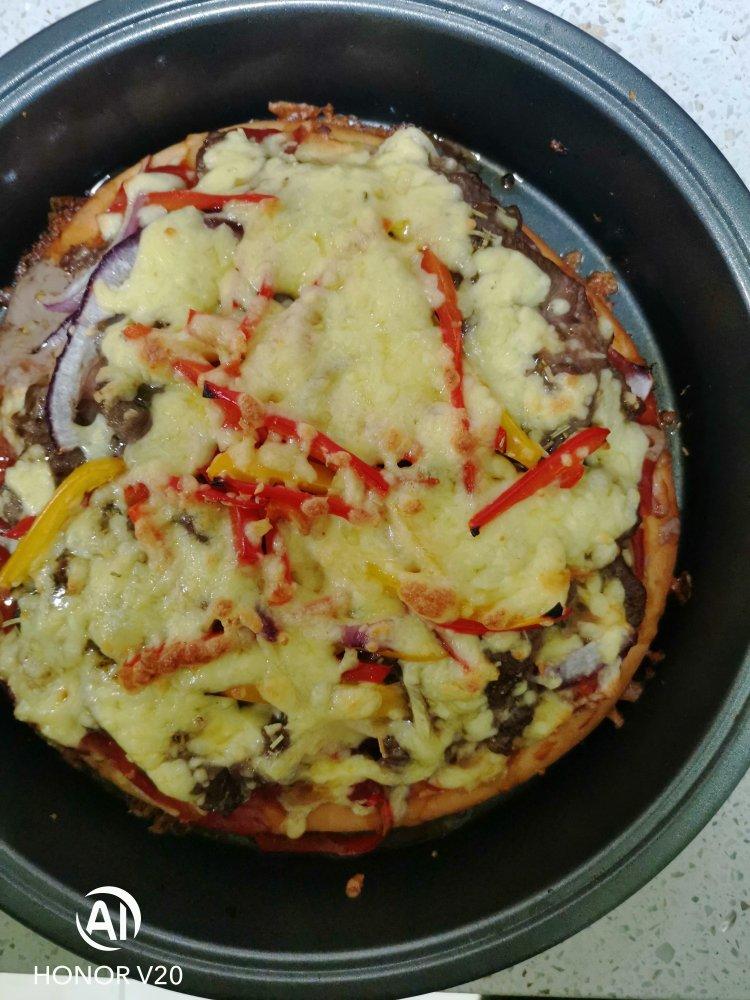 花元米团 做过 黑椒牛肉厚底披萨 牛肉太多了,牛气冲天!🐮🐮🐮!把饼先烤10分钟,然后放的料,牛肉用雪花牛肉片,直接腌制以后就可以,料足,又烤了11分钟。出炉以后,奶酪拉丝效果不太好,不知道啥原因,牛肉不硬。底料用的番茄沙司,搭配迷迭香,不错有披萨的味道。 2021-02-16