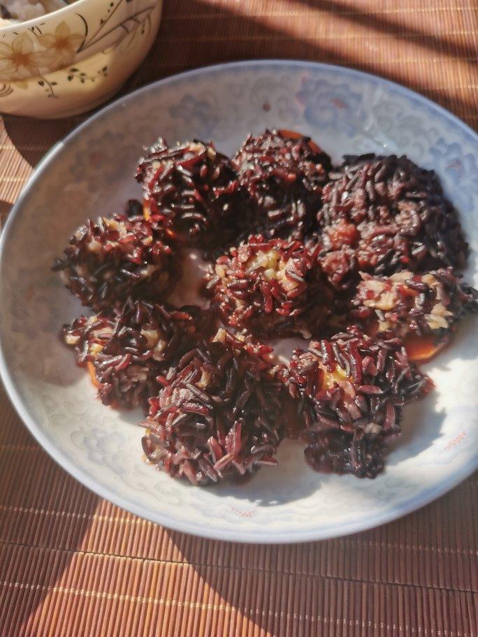 包饺子剩的馅儿,在紫米里滚一滚,蒸出来很好吃哦!