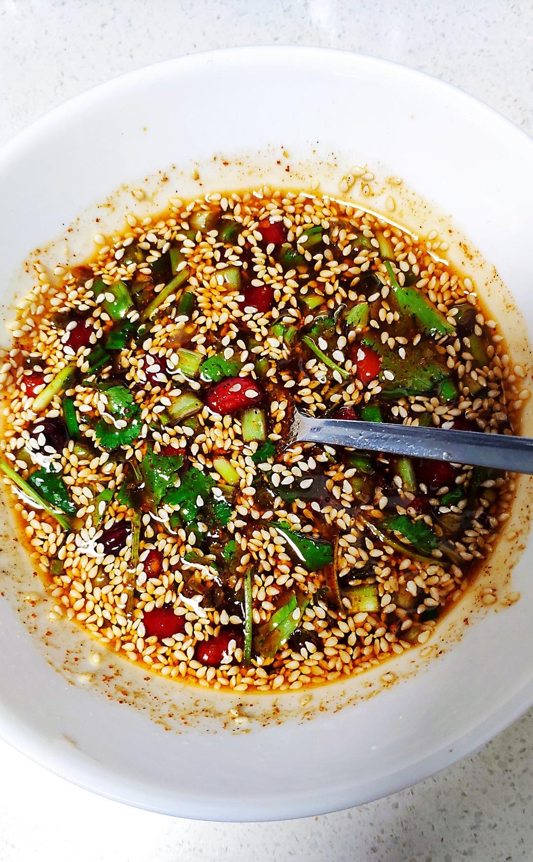 淋油前放入了小葱,多加了花椒粉,用调出的蘸料做了酸辣粉,很不错!