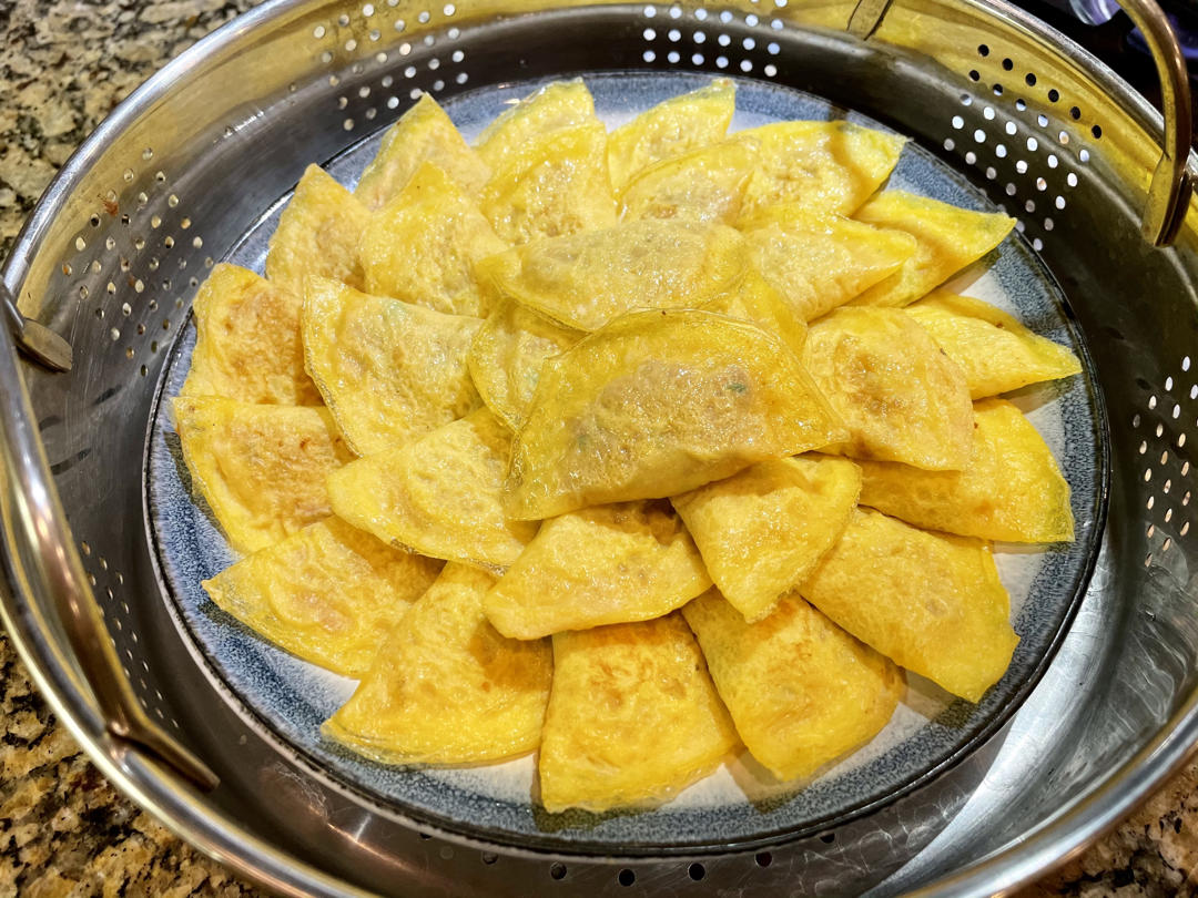 7070璘 做过 蛋饺 即使远在他乡也每年必做想让自己的小宁也能体会一点我小时候过年的味道听着猪油滋滋的作响看着蛋饺一个个成型淡淡烟火中回忆儿时的家......图4⃣️是去年圣诞时做的 分了几盘给邻居们也尝尝#蛋饺# #手工蛋饺 上海蛋饺 蛋饺# 2021-02-24