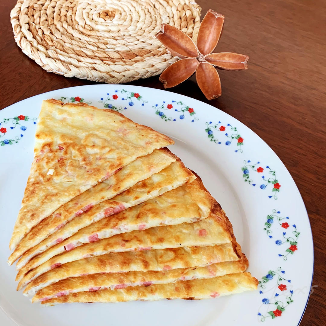 简化午餐——摊蛋饼:鸡蛋液+面粉+火腿丁+洋葱丁+食盐
