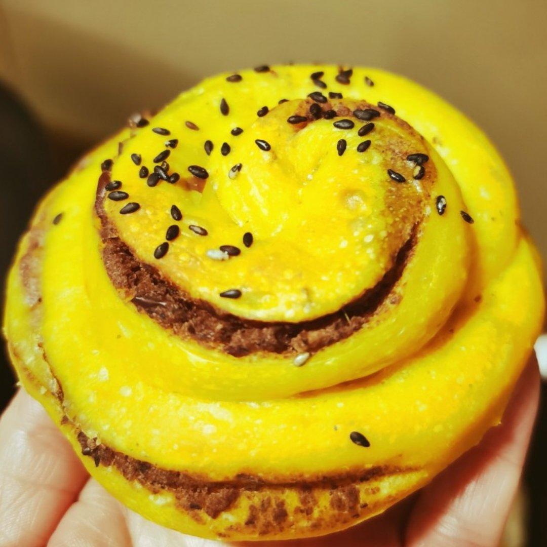 南瓜泥和面,面团没加糖,蜂蜜豆沙馅,看着不错,太晚了不敢尝啦,明天早餐有啦