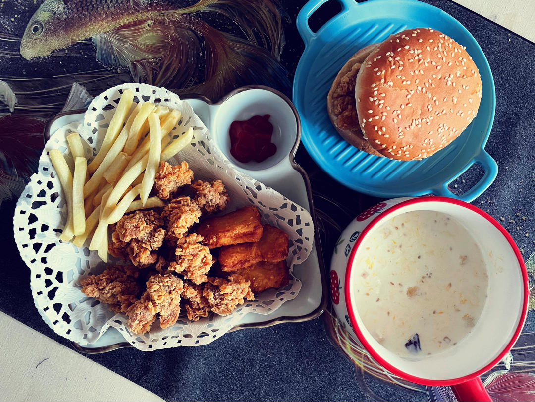 鸡蛋牛奶燕麦粥,炸薯条鸡米花鸡块,汉堡🍔