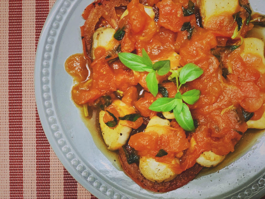香煎素带子配罗勒番茄汁