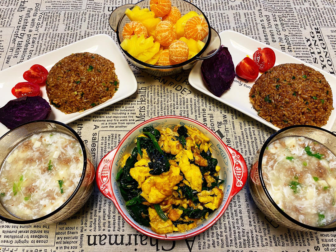 ❤️D681❤️西湖牛肉羹➕葱油炒饭➕蒸紫薯➕菠菜炒鸡蛋➕小菠萝🍍砂糖橘🍊[太阳]