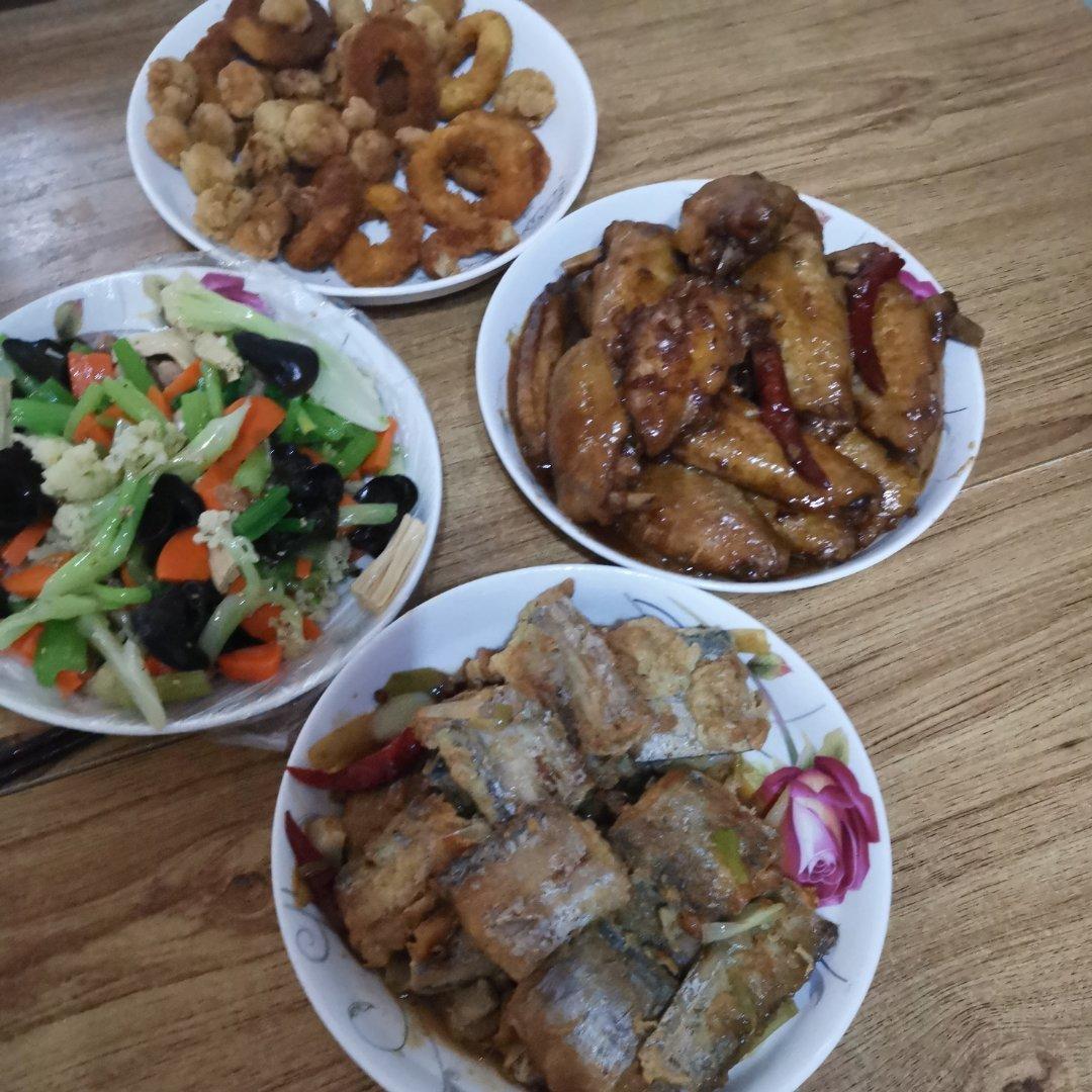 今天难得有空炖的带鱼和鸡翅,炸了个鸡米花,拌个凉菜,自己还挺满意。