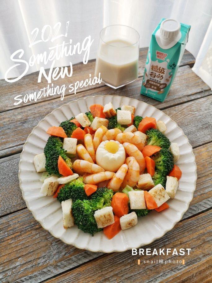吐司蔬菜鲜虾沙拉+好哩超级谷的麸皮燕麦浆