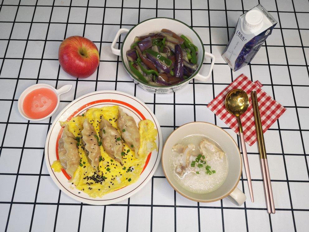 排骨粥,蛋抱饺,青椒茄子,苹果,牛奶