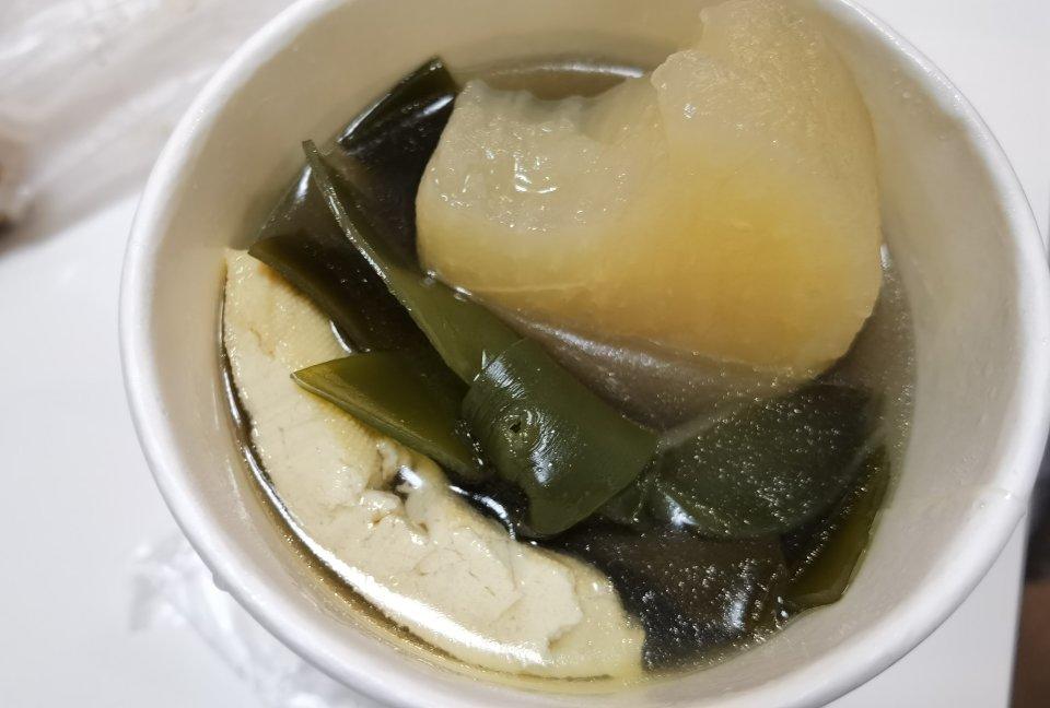 海带两串,包菜肉卷一个,一块萝卜,一块豆腐,一个茶叶蛋