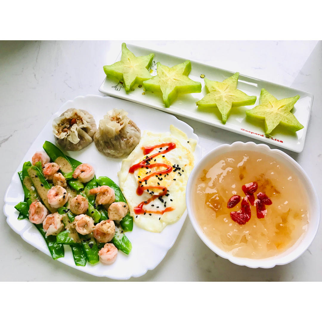 桃胶皂角米银耳汤🍹白灼荷兰豆🍤 烧脑🥟煎蛋🍳杨桃🌿