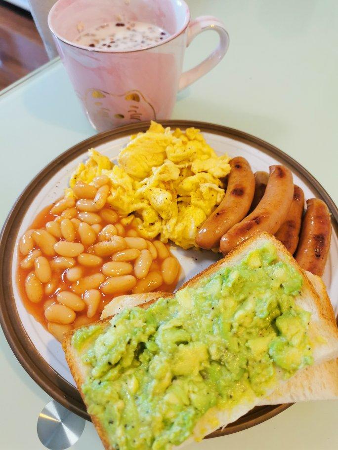 周末早餐~~~香肠鸡蛋牛油果土司,罐头番茄豆味道不错,再+牛奶麦片营养杠杠滴