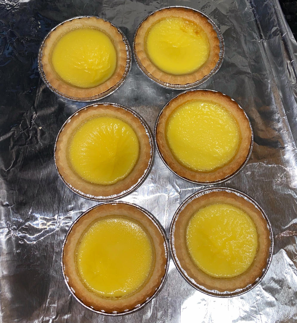 反应说蛋挞液不够甜,看来下次做得加糖。。。大概360℉烤20分钟焖5分钟,看上色情况加个烤盘挡一下