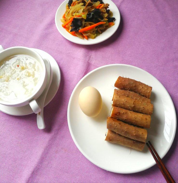 早上好!今日早餐:淮山+鸡蛋+燕麦粥+肉片炒胡萝卜黑木耳西芹洋葱