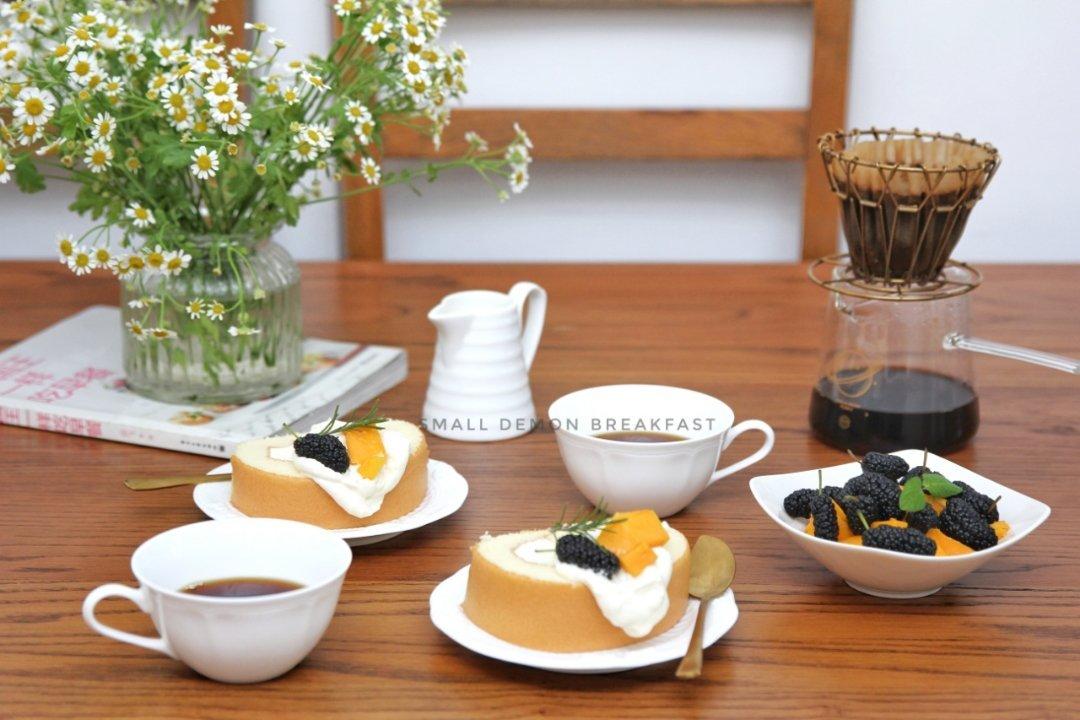 小一妖 做过 早餐•2021年4月20日 [cp]早上好~妖家的早餐奶油蛋糕卷、咖啡、芒果和桑椹~ #早餐•2021年4月20日# 2021-04-20