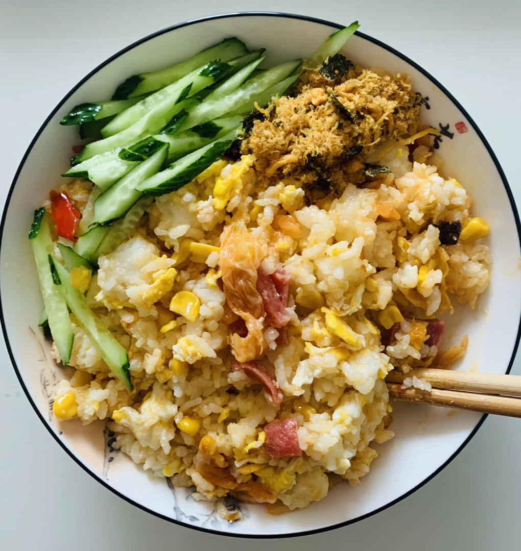 炒米饭:加入了鸡蛋、辣白菜、腊肠、玉米粒、黄瓜丝、肉松海苔。味道不错!