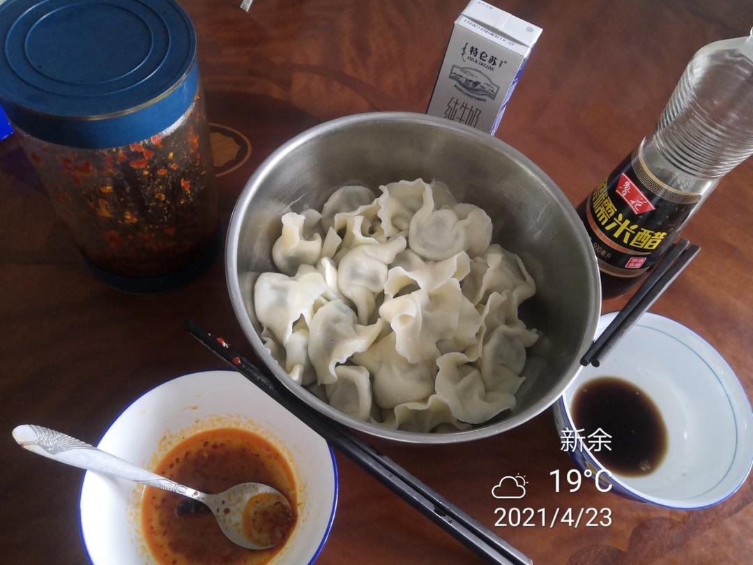 手工韭菜水饺配香醋 自制牛肉辣酱 特仑苏