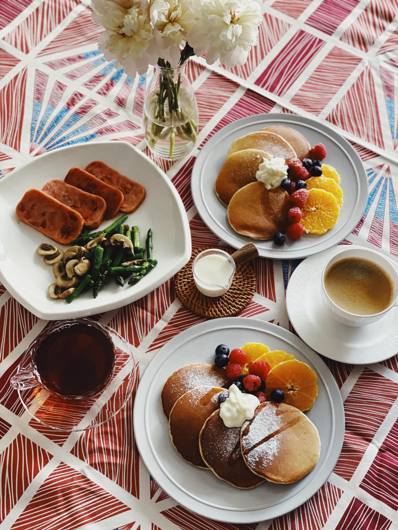 假日在家brunch,美式松饼,芦笋炒蘑菇,煎午餐肉以及咖啡和红茶。
