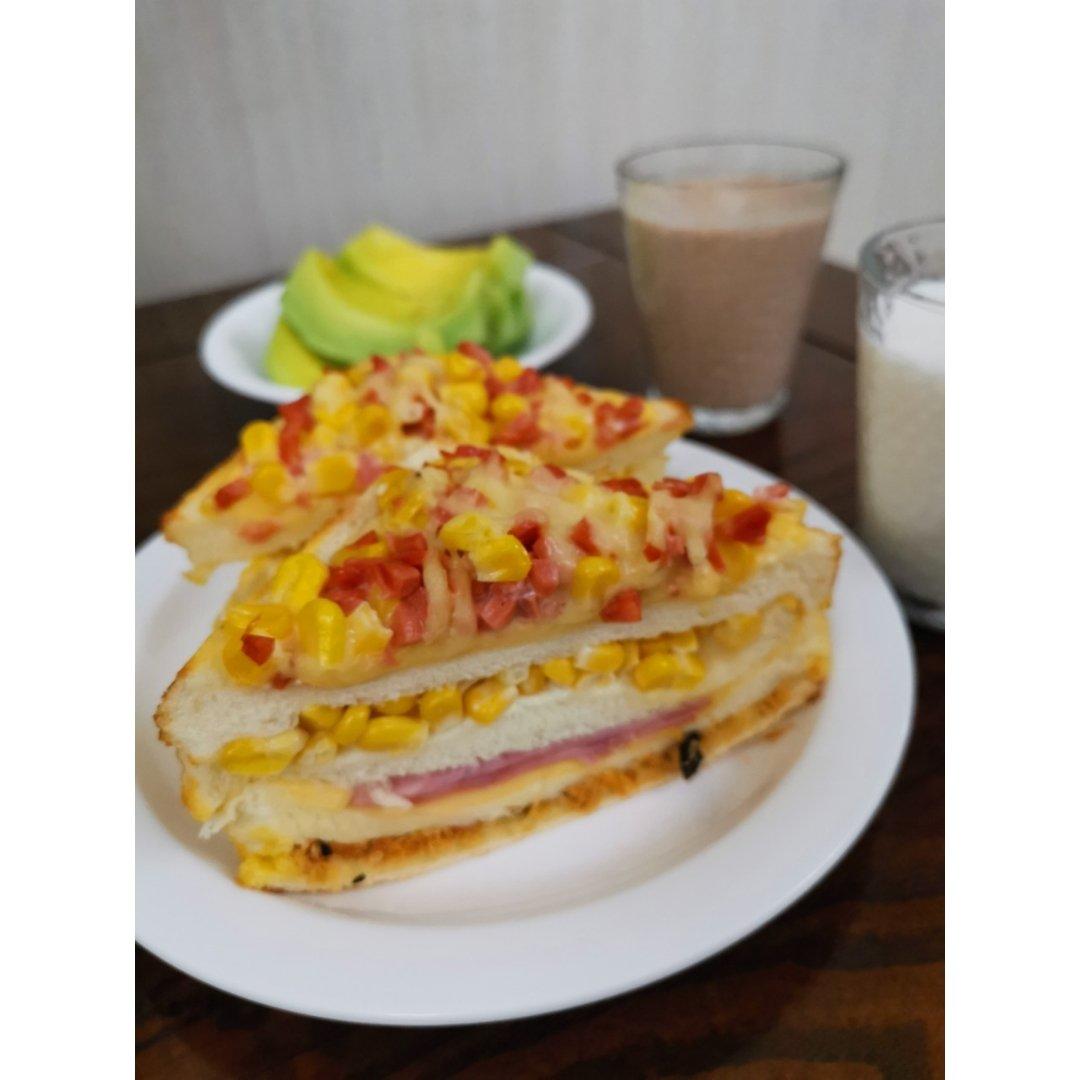 玉米三明治、水果、豆浆、牛奶
