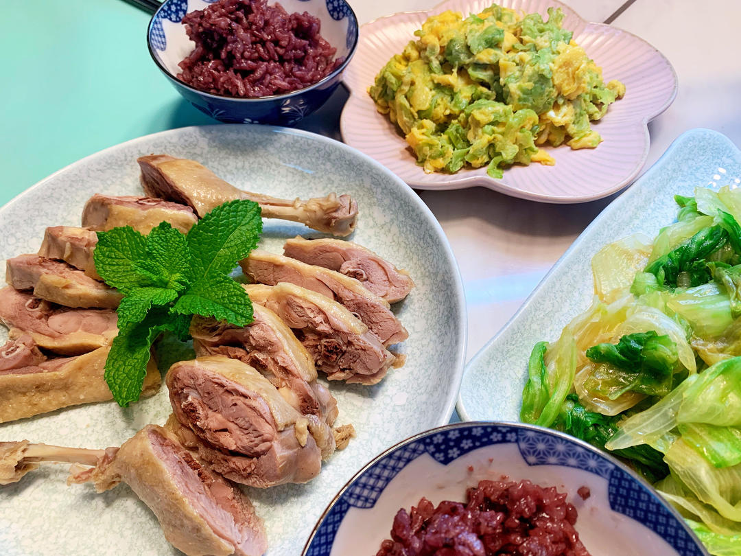今日晚餐 盐水鸭腿 凉瓜炒蛋 紫糯饭 蚝油西生菜