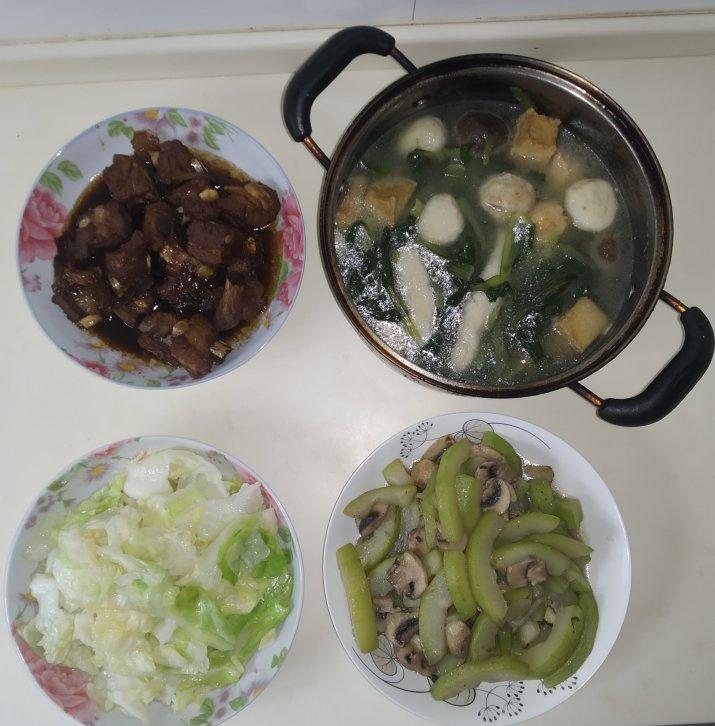 6.17(周四)家有学生每日营养晚餐:糖醋排骨、手撕包菜、西葫芦白菇、小青菜各色肉丸汤