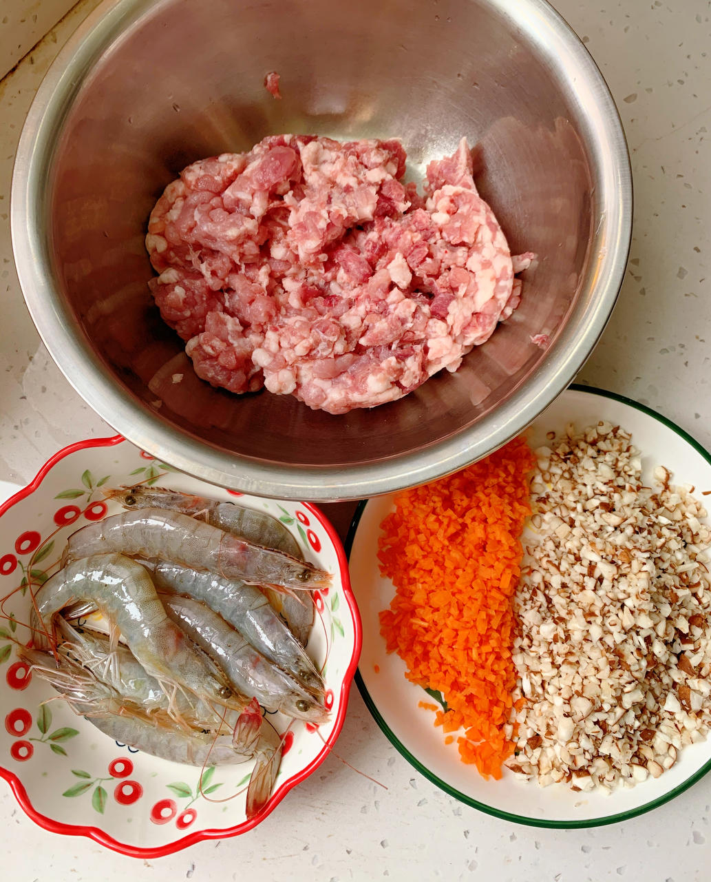 肉馅里加了点虾仁,打了一个鸡蛋,又加了点香菇和胡萝卜,没想到意外的好吃,儿子吃了一大碗!