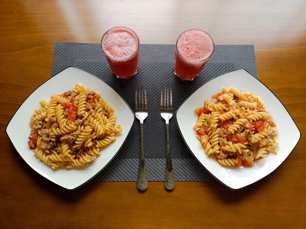 炎炎夏日,来杯冰镇西瓜汁配上一盘番茄肉沫意面🍝
