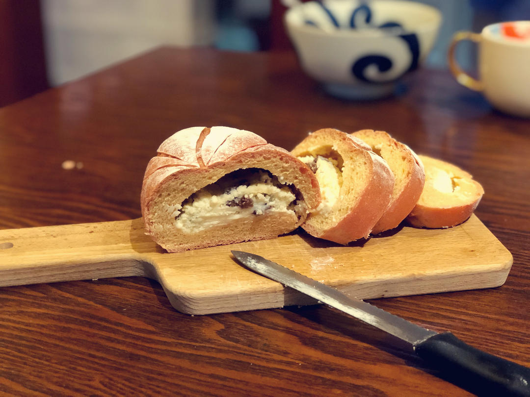 继续用这个方子的面团,折腾其他样式的面包……酒漬葡萄干奶酪包🐷🐷🐷