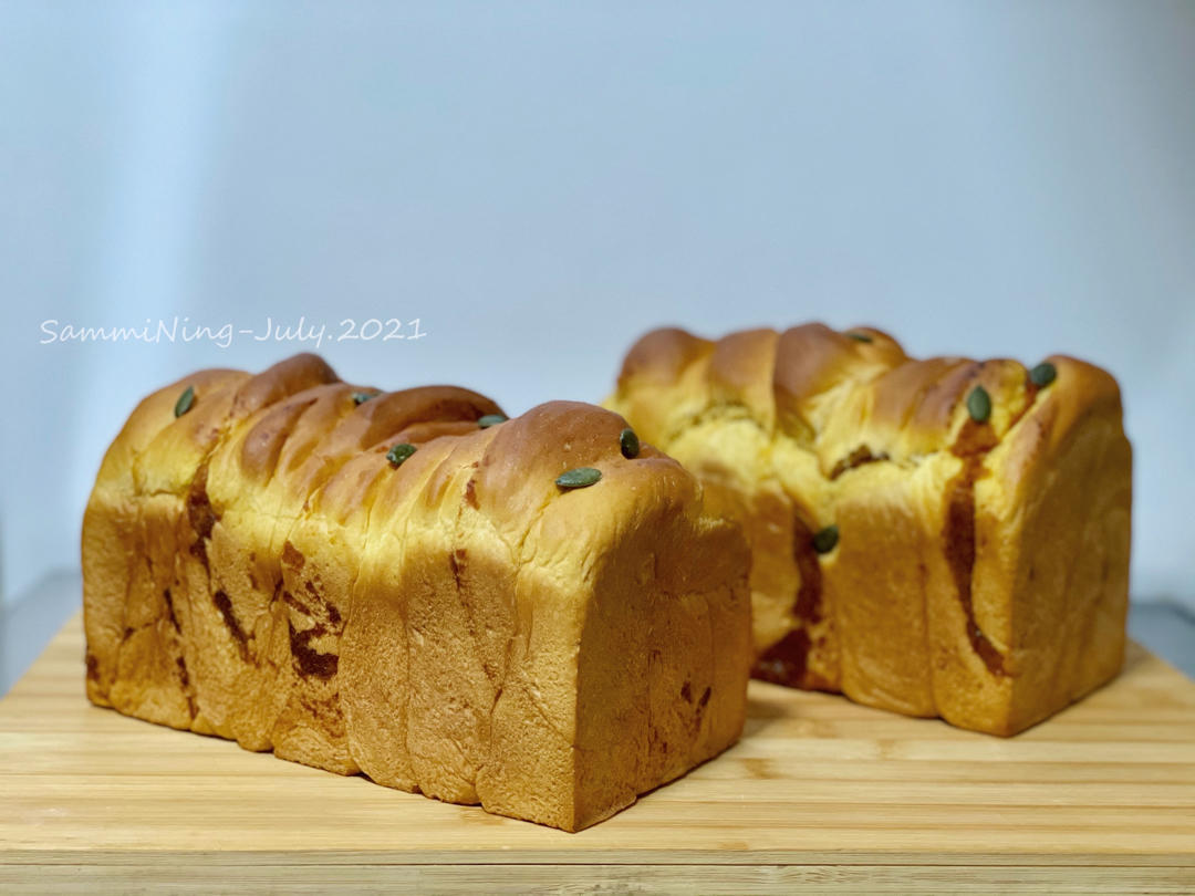 奔跑系加菲 做过 小卖部的100个吐司 No.38 Double南瓜吐司为了消耗红糖,用了一半砂糖一半红糖,液体减少了10g,鲜酵母稍微多加了一点点,成品组织还可以,口感湿软弹糯,比单纯的南瓜吐司口感层次更分明,可以多刷!#晚餐•2021年7月11日# 2021-07-11