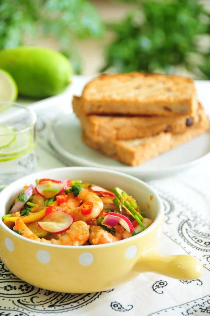 泰式柠檬虾:鲜虾、洋葱、香菜、樱桃小萝卜、青黄柠檬、青红小米辣、大蒜,烤核桃全麦面包片,柠檬水。