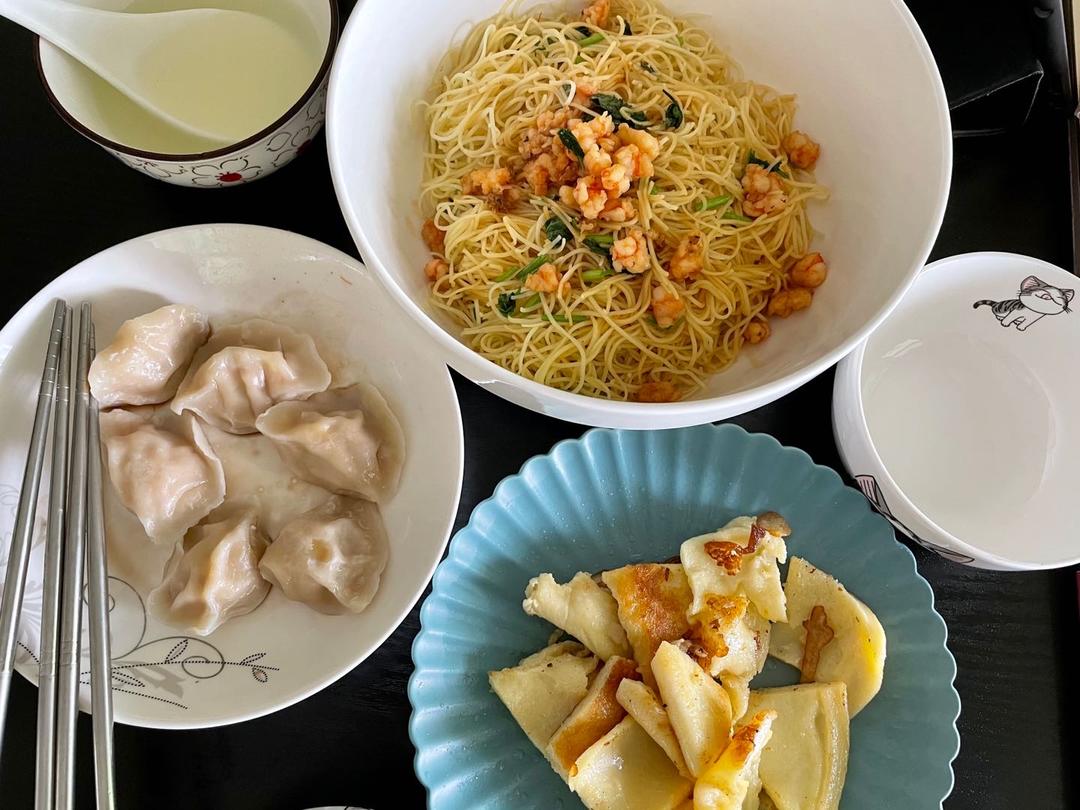虾仁拌面,水煮白菜猪肉饺,牛奶鸡蛋饼