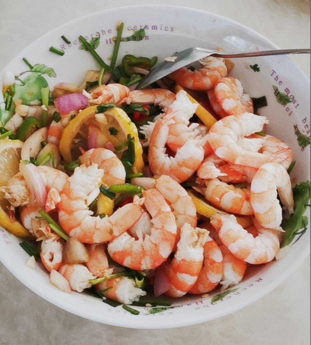 寸金_s3rj 做过 泰式柠檬虾 四个小米椒,一根大螺丝椒,洋葱买的是小的,所以放了一整个。味道还是有点冲,还是应该只放半个。家里人都不太能吃辣,辣椒还是放的有点多。拌好以后尝了下,不够酸,就又加了一个柠檬。拿保鲜膜包好了放冰箱,期待成品。 2021-07-26
