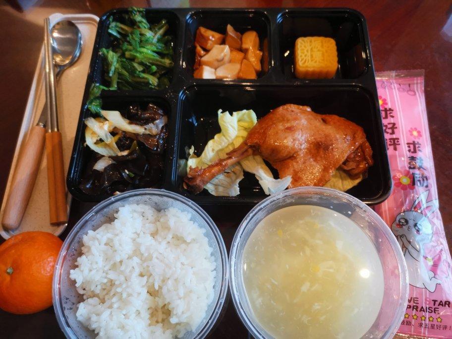酱鸭腿,蘑菇炒肉,素炒青菜,清炒杏鲍菇,白米饭,玉米蛋花汤,绿豆糕,小橘子
