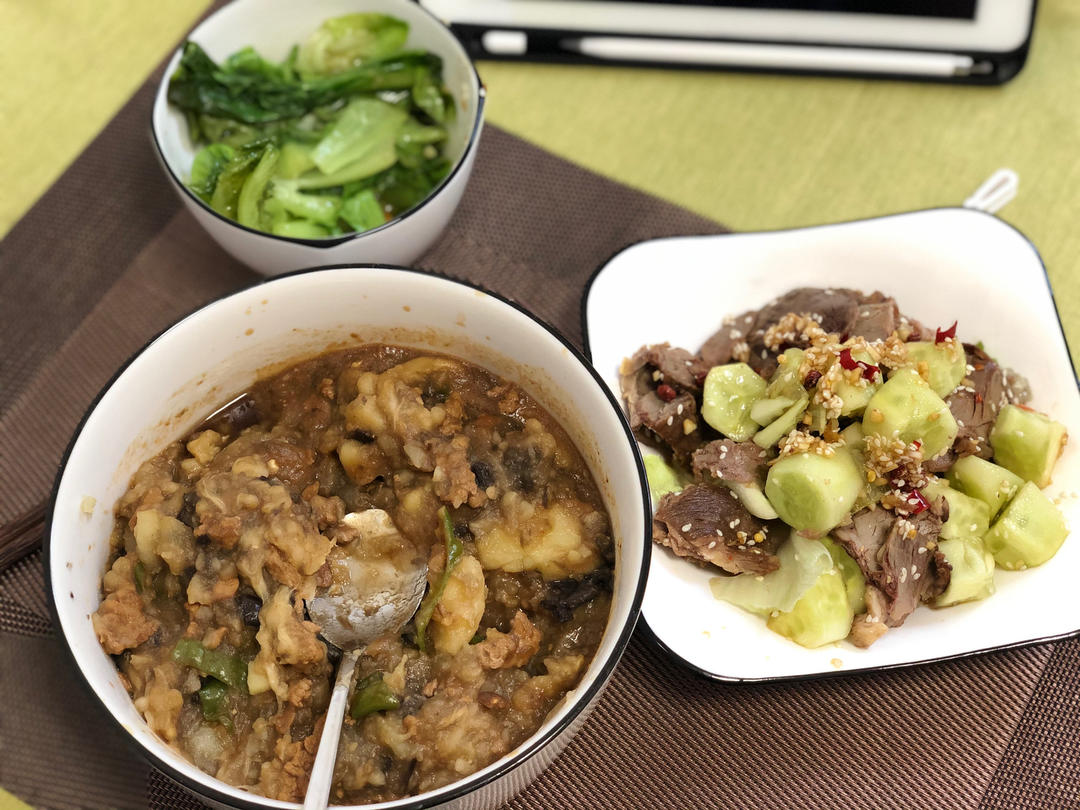 evonneluv 做过 晚餐•2021年8月2日 #晚餐•2021年8月2日# 【茄子拌土豆】用掉了家里的土豆和茄子,用掉了家里之前剩下的肉酱和青椒;【黄瓜拌酱牛肉】吃掉了之前台风前囤的黄瓜和酱的牛肉;【清炒生菜】吃掉了台风天囤的生菜#感觉自己很健康# 2021-08-02