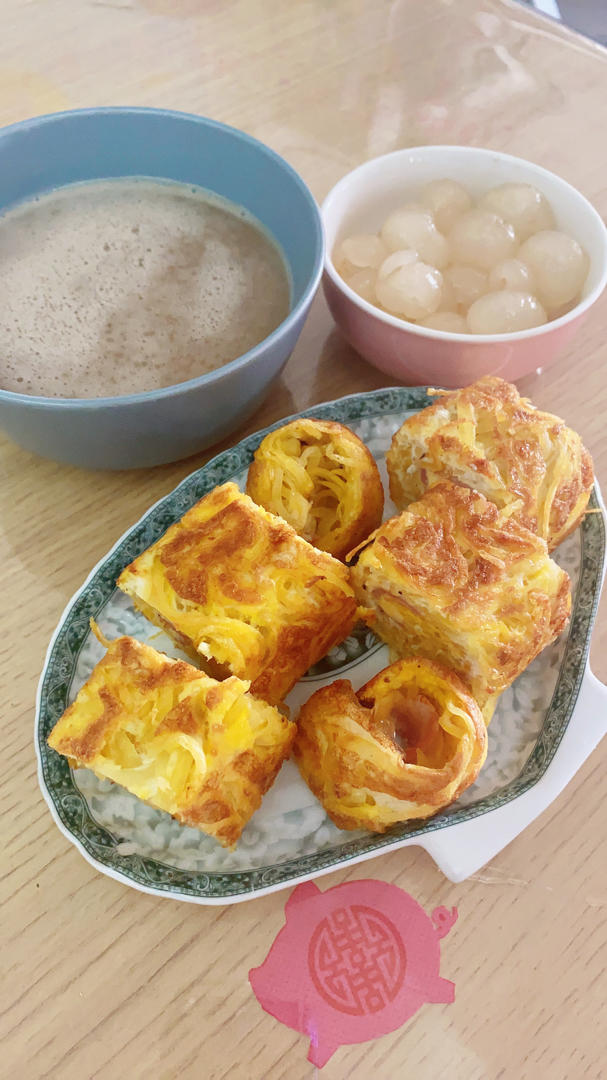 土豆丝培根奶酪卷、红枣银耳莲子糊、秋天的龙眼(肉)