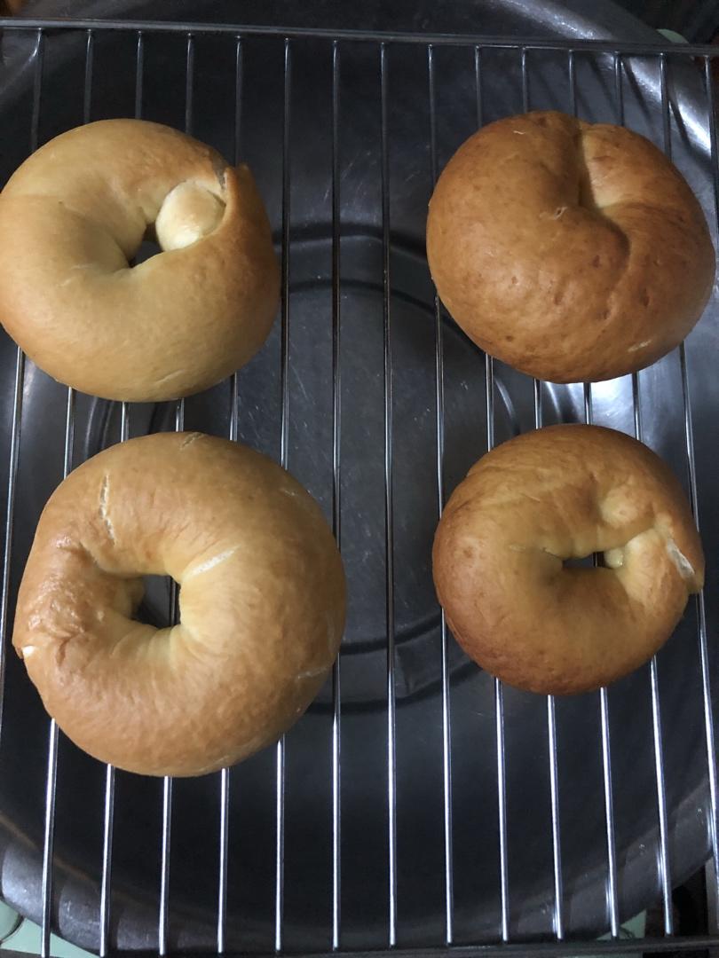 thestars 做过 2021年08月30日 #晚餐•2021年8月30日#配方减半做的,用的金沙和特精高筋面粉 ,吸水性比小高姐面粉强,所以减了20g水,第二次加面粉没全部加入,减少了5g。揉面后移到菜板上整形松弛15分钟,然后分4份,借鉴了昊宝妈整形手法,做了葡萄干贝果。这次很成功,贝果可以飘在糖水上。30度二次发酵30分钟,230度17分钟。 2021-08-30