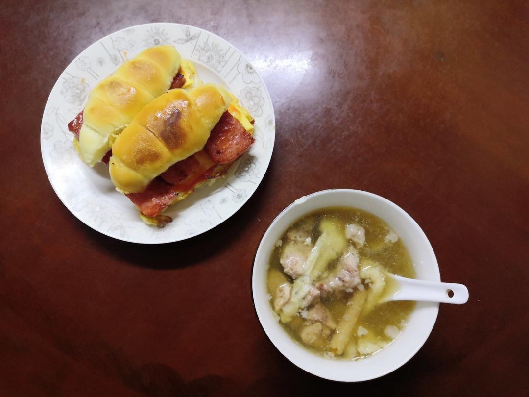 早餐:鱼胶排骨清补凉炖汤、牛角包三明治
