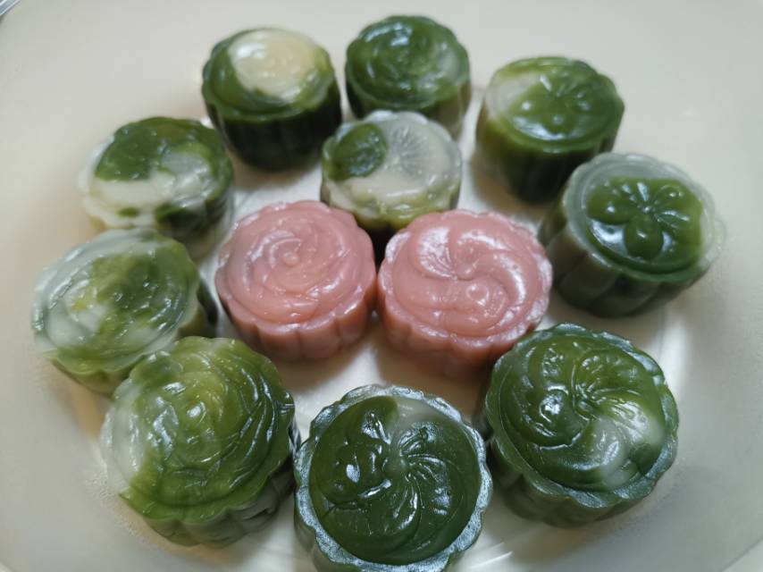 月饼季,第一轮冰皮月饼上线,抹茶放多了点,颜色深了些,不过还是蛮喜欢,对绿色情有独钟。