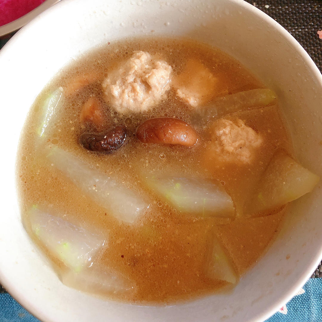 *冬瓜丸子汤*半斤肉馅,冬瓜适量。肉馅,放入葱姜大料花椒水,生抽老抽盐适量。汤里放香菇三朵,盐适量。出锅后可以单放白胡椒,紫菜虾皮,醋…