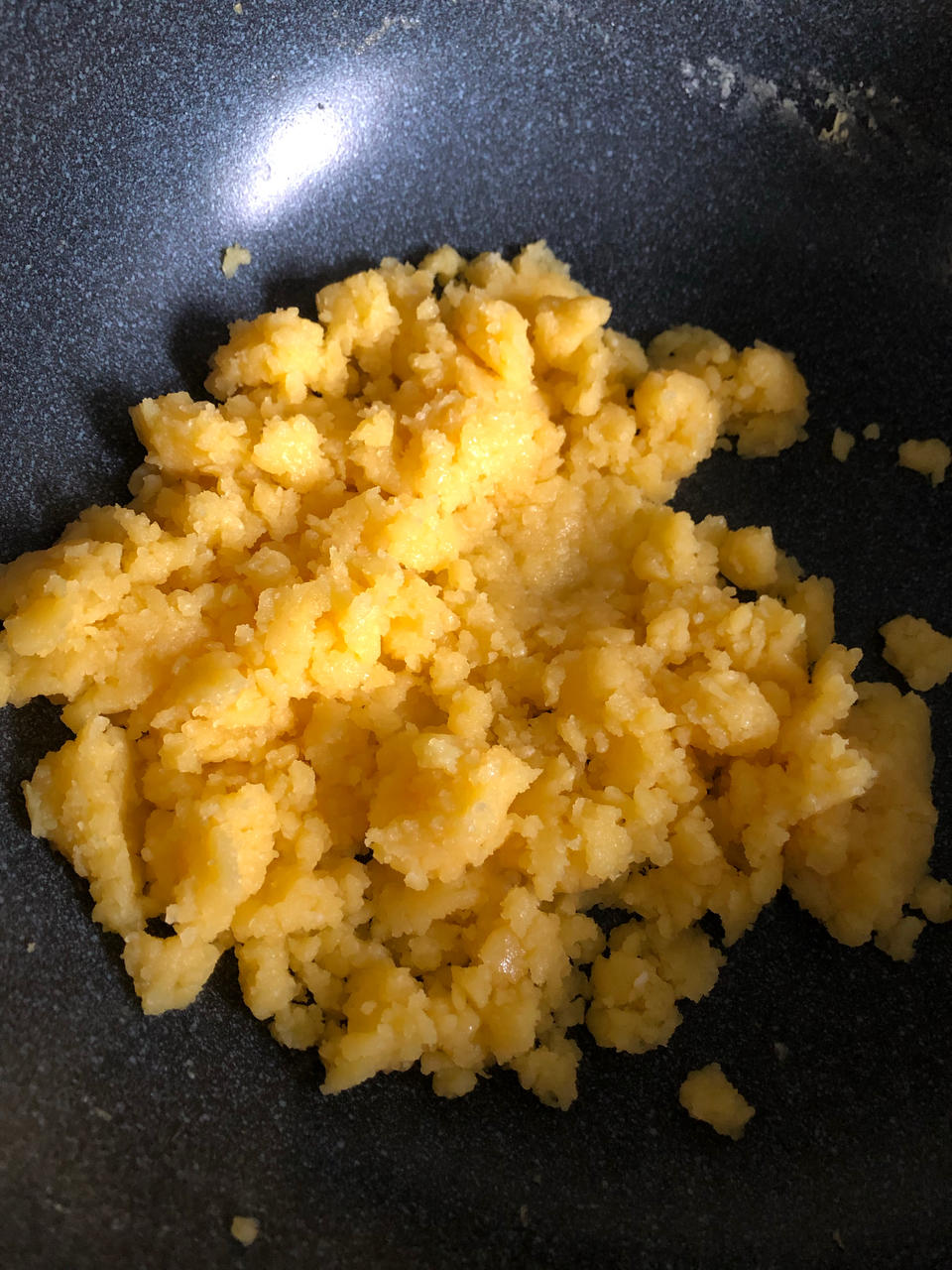 按原方做出来是图一、二的效果,有点散,口感偏干,不甜。我又加了少许淡奶炒了一下,就能成型了,而且口感细腻,还增加了甜味儿。