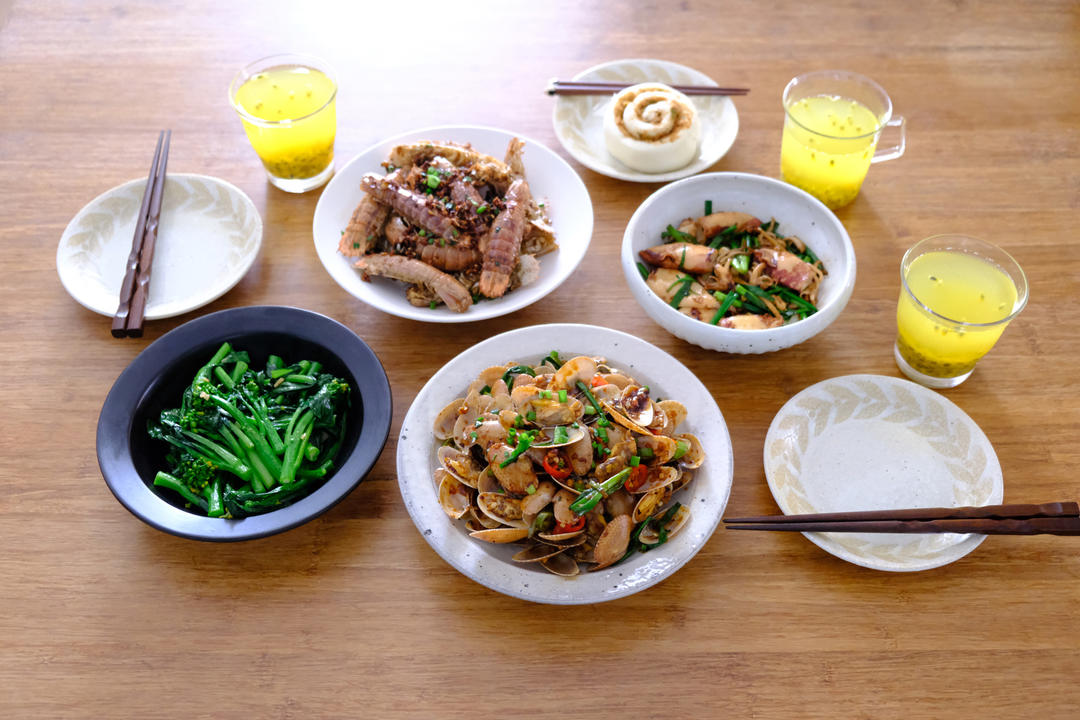 辣炒花蛤|椒盐皮皮虾|红烧小鱿鱼|清炒菜心苗|肉松卷