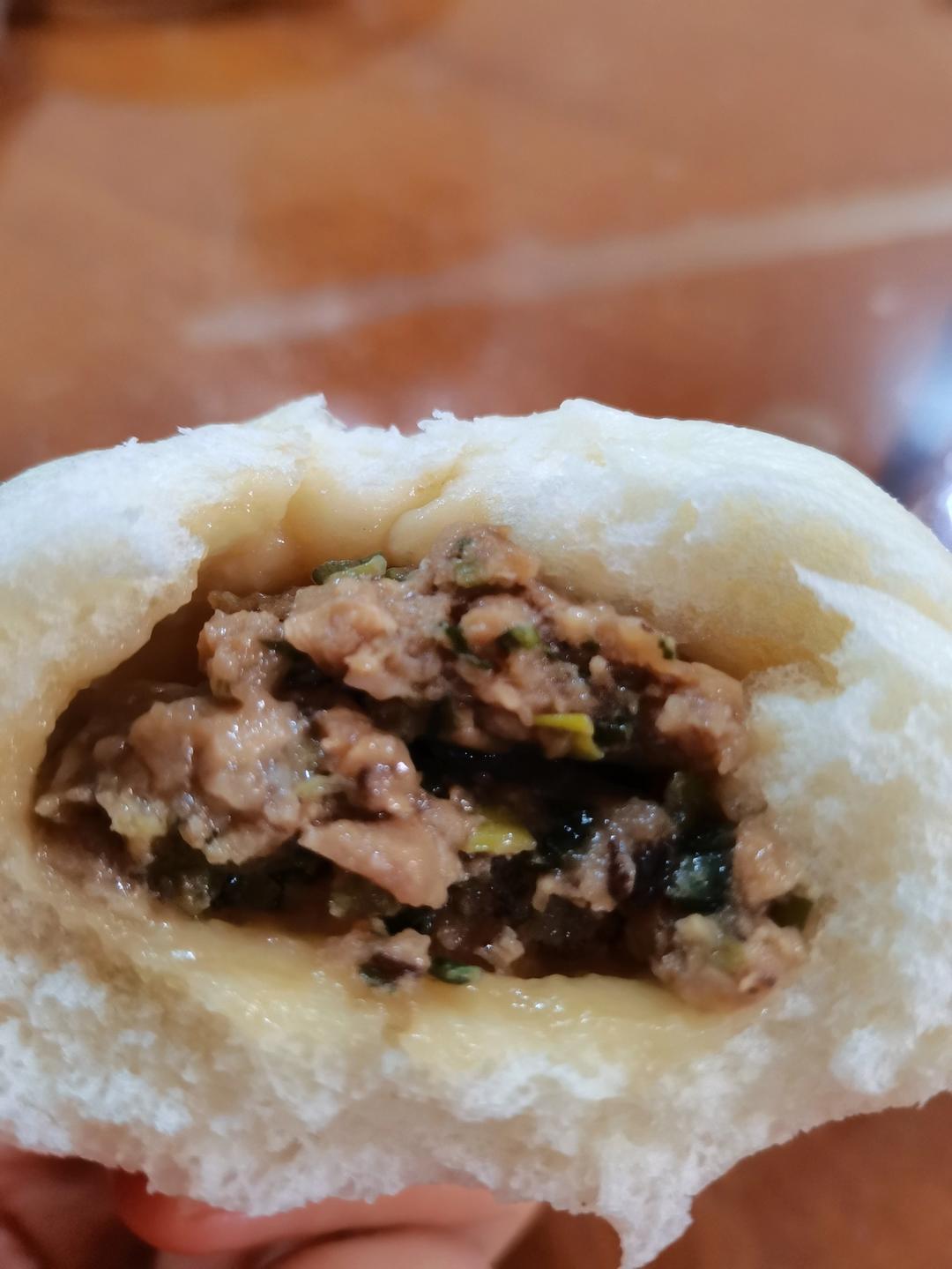 SY晴天 做过 一次发酵肉包子 用了二发,香菇小葱猪肉咸,面粉用了480克,水量用了面粉的一半再看状态加了一些,做了21个,每个面团38克。加了用了猪油和两勺奶粉厨师机揉面。不用泡打粉,鲜酵母发面。 2021-10-14