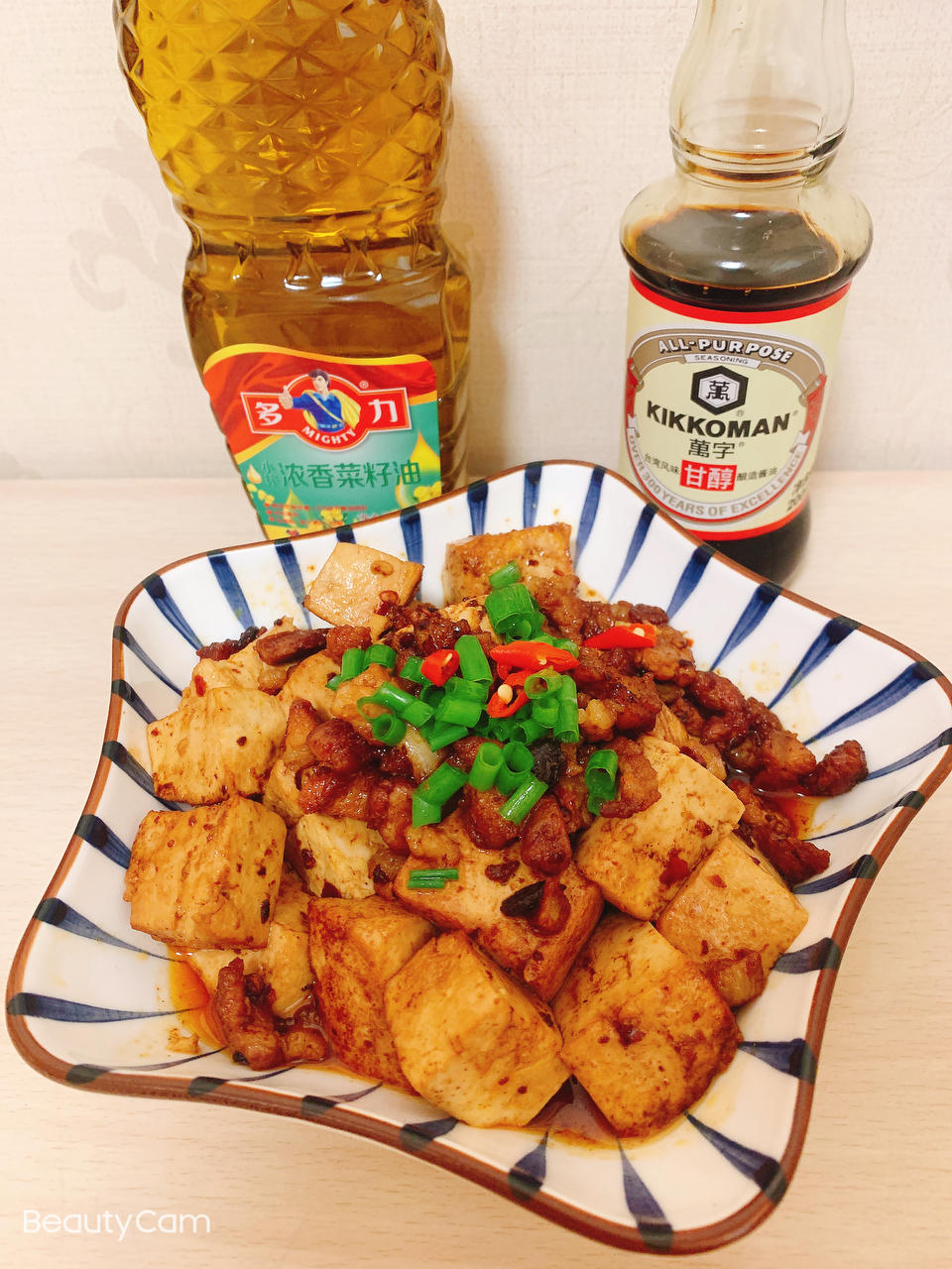 肉沫豆腐、蒜蓉生菜,有好油做好菜,用多力菜籽油和万字酱油调味做的菜就是香。