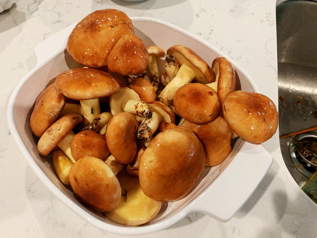 lizlisacat 做过 晚餐•2021年10月29日 阴雨绵绵,在后院收获了野生牛肝菌#晚餐•2021年10月29日# 处理起来很麻烦,要把上面那层膜撕掉,不然会拉肚子,然后做了锅焖面😄 2021-10-30