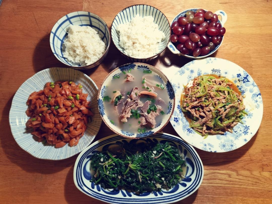 肉丝炒莴笋 萝卜干毛豆 蒜泥菠菜 排骨莲藕汤