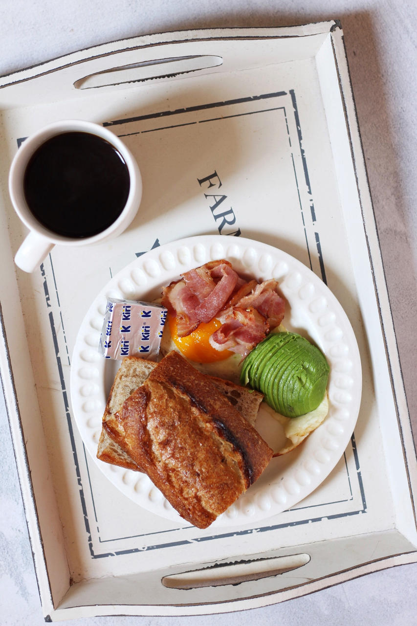 法棍、培根、牛油果、咖啡