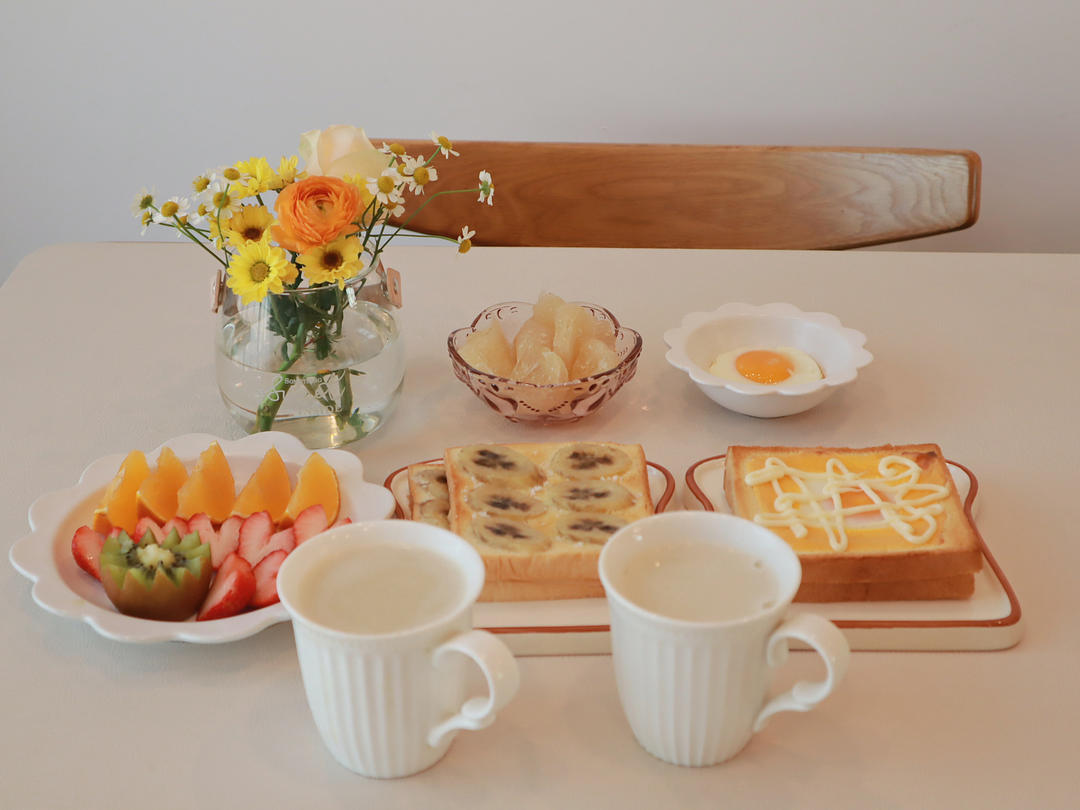 今日早餐:香蕉烤吐司,芝士火腿吐司,煎蛋🍳,红枣豆浆,草莓,橙子,猕猴桃。